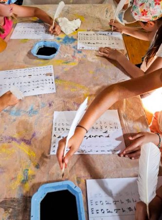 L’invention de l’écriture marque le passage de la Préhistoire à l’Histoire. Elle est née du besoin de l’homme d’avoir des traces de ses activités. A travers notre atelier calligraphie, l’animateur reviendra sur les différentes phases d’évolution de l’écriture : pictogrammes, écriture cunéiforme… Les enfants s’initieront au premier alphabet au monde, écrieront leur prénom en hiéroglyphes et pratiqueront l’écriture à la plume comme au Moyen-âge.